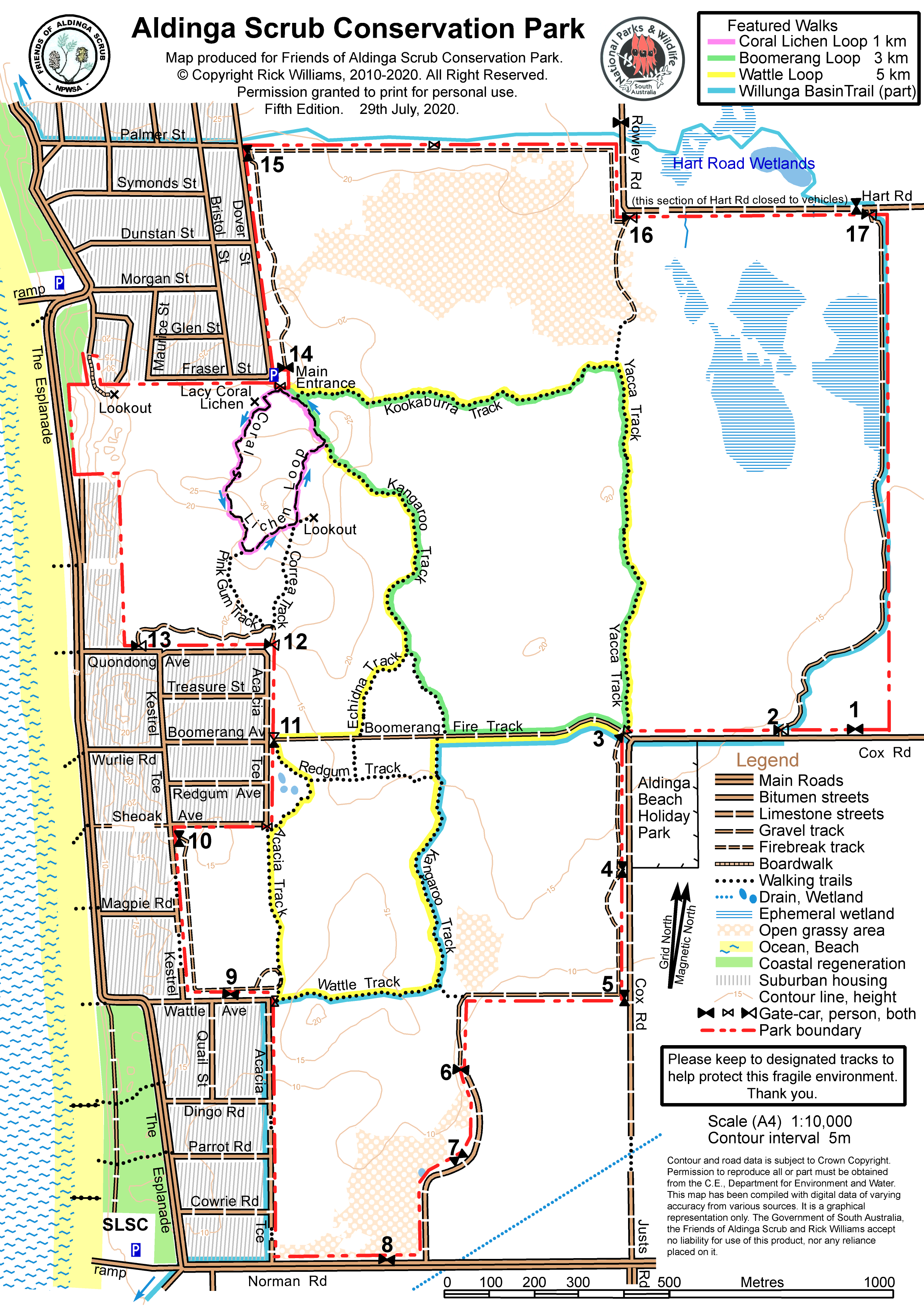 There are a number of entry points to the Park. Possibly the best is the Dover Street car park on the corner of Dover and Fraser Streets in Aldinga Beach. This is the starting point for three trails including the Coral Lichen Circuit.